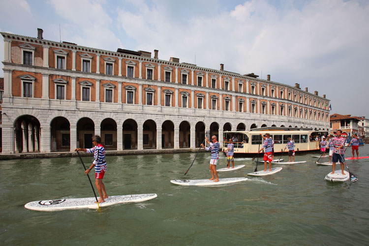 On 27th of June 2010 was written a wonderful page of our SUP history: about 100 people from all around the world have gathered in Venice to attend the event organized by RRD and Nissan, under the sponsorship of the municipality of Venice, to promote the Surf Culture in the Venetian lagoon. The parade, which took the riders on their SUP (Stand Up Paddle Boards) escorted by the historical "sandals" of the Rowing Settemari along more than 6km from the Tronchetto through the Grand Canal till the Arsenale (historical Venice shipyard), has created a new link between the Culture of Surf and the city of Venice. During the parade of the hundreds, thousands of people have realized that there is another way to cut the water surface on a board using a paddle as a vehicle of propulsion. While tourists snapped photos from the banks and bridges of Venice, from the gondolas and from the ferries, the Venetians looked out their windows, curious to witness the spectacle of those surfers who paddle easily along the Grand Canal, with gondolas and other boats engaged in their daily traffic.